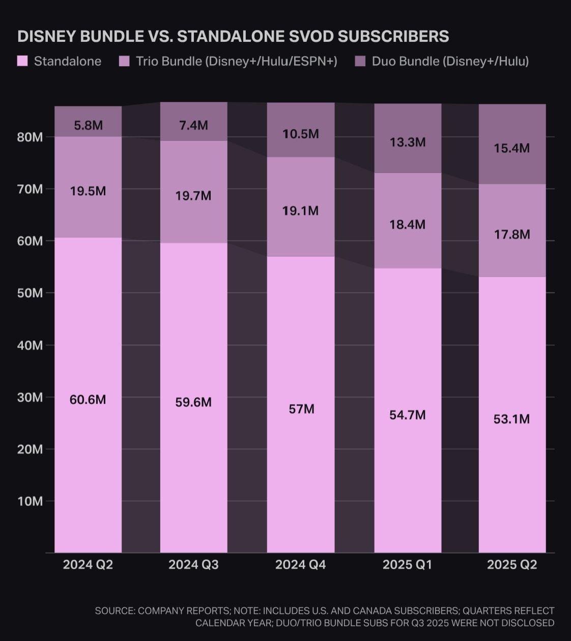 * 출처: Company Reports. 미국·캐나다 구독자 기준, 달력연도 기준. 트리오 번들: Disney+/Hulu/ESPN+, 듀오 번들: Disney+/Hulu. 2025 Q3 번들 구독자는 미공개.