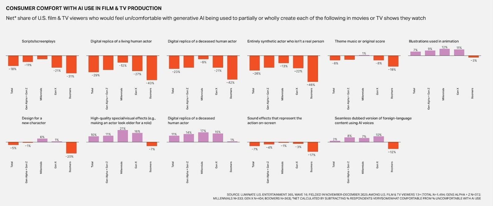 이 와중에 루미네이트의 소비자 데이터는 중요한 시그널을 제공한다. 관객이 거부하는 대상은 AI 기술 자체가 아니다. 문제는 ‘대체’다. AI가 인간 창작자의 역할을 대신한다는 인식이 형성될 때, 거부감은 급격히 증가한다. 실제로 AI가 작성한 시나리오에 대한 시청 의향 순 부정 수치는 6개월 사이 -11%p에서 -19%p로 악화됐다. 이는 단순한 적응 지연이 아니라, 인식의 방향 자체가 부정적으로 이동하고 있음을 의미한다.