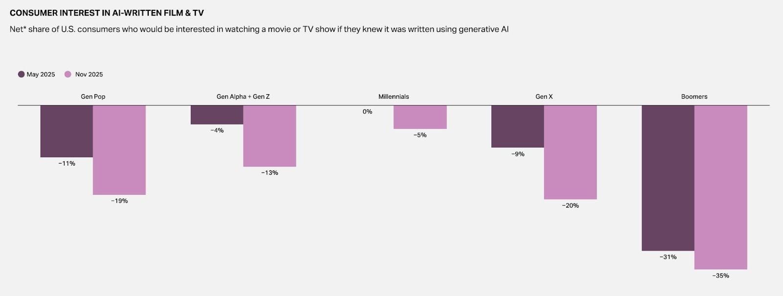 전체 일반 대중(Gen Pop) 기준으로, “보고 싶다” 응답 비율에서 “보고 싶지 않다” 비율을 뺀 순 시청 의향은 5월 –11%p에서 11월 –19%p로 악화됐다. 가장 기술에 열린 Gen Alpha+Z 세대도 –4%p에서 –13%p로 9%포인트나 급락했다. 밀레니얼은 5월에는 0%p(긍정과 부정이 균형을 이룬 완전 중립)이었지만, 11월에는 –5%p로 돌아서며 “조금은 보기 싫다” 쪽으로 기울었다. Gen X는 –9%p에서 –20%p로, 부머 세대는 –31%p에서 –35%p로 더 깊은 마이너스로 내려앉았다. 수치보다 더 중요한 것은 방향이다. 어떤 세대도 “시간이 지나면서 AI 대본에 더 관대해지는” 패턴을 보이지 않았고, 모든 세대에서 거부감이 더 강해졌다.