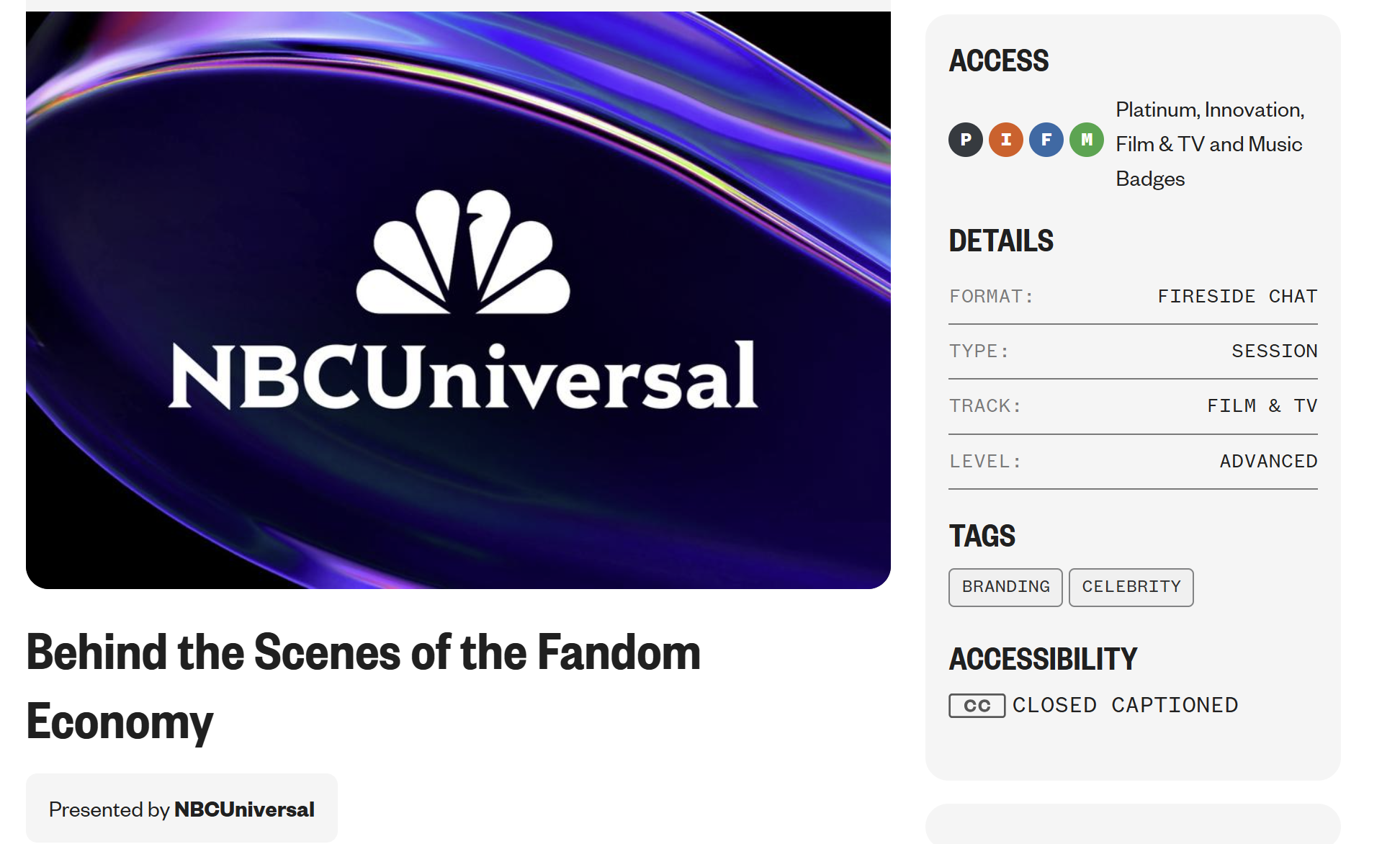 4. [SXSW 2026 공식 일정] Behind the Scenes of the Fandom Economy (Session PP1162944) — NBCUniversal Fireside Chat, 2026.03.15 https://schedule.sxsw.com/events/PP1162944