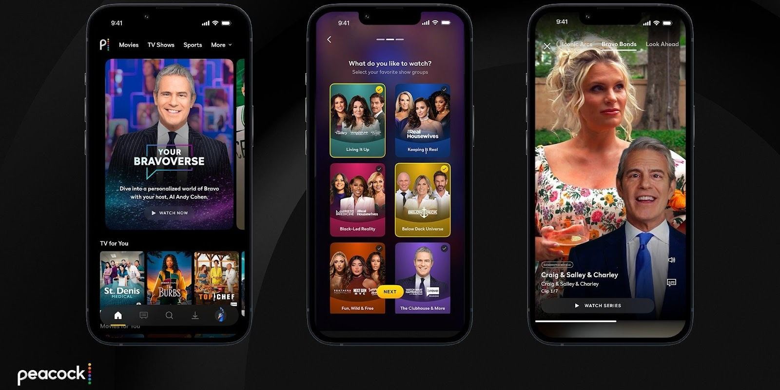 2026년 여름 출시 예정인 ‘Your Bravoverse’는 스와이프형 버티컬 피드 위에서 앤디 코헨 AI 아바타가 투어 가이드를 맡는 다층 큐레이션 시스템이다. 사용자가 처음 진입할 때 선호하는 브라보(Bravo) 프로그램과 기억에 남는 아이코닉 순간들을 선택해 취향 프로필을 구성하면, AI가 5,000시간 이상 축적된 브라보 아카이브에서 클립을 추출·분석해 개인화 플레이리스트를 생성한다. UI 상단에는 Weekly Drop(주간 추천)·Best Of(명장면)·Iconic Arcs(서사 축 연결)·Bravo Bonds(관계·캐릭터 중심) 4개 탭이 제공되며, 노출되는 모든 클립에는 ‘Generated with AI’ 레이블이 함께 표기되어 이용자에게 생성형 콘텐츠임을 명확히 알린다.