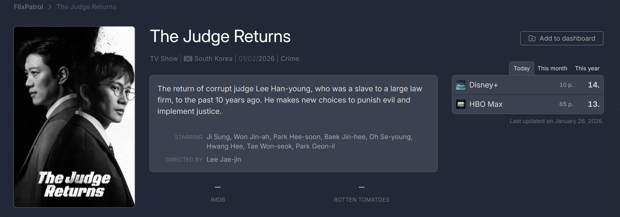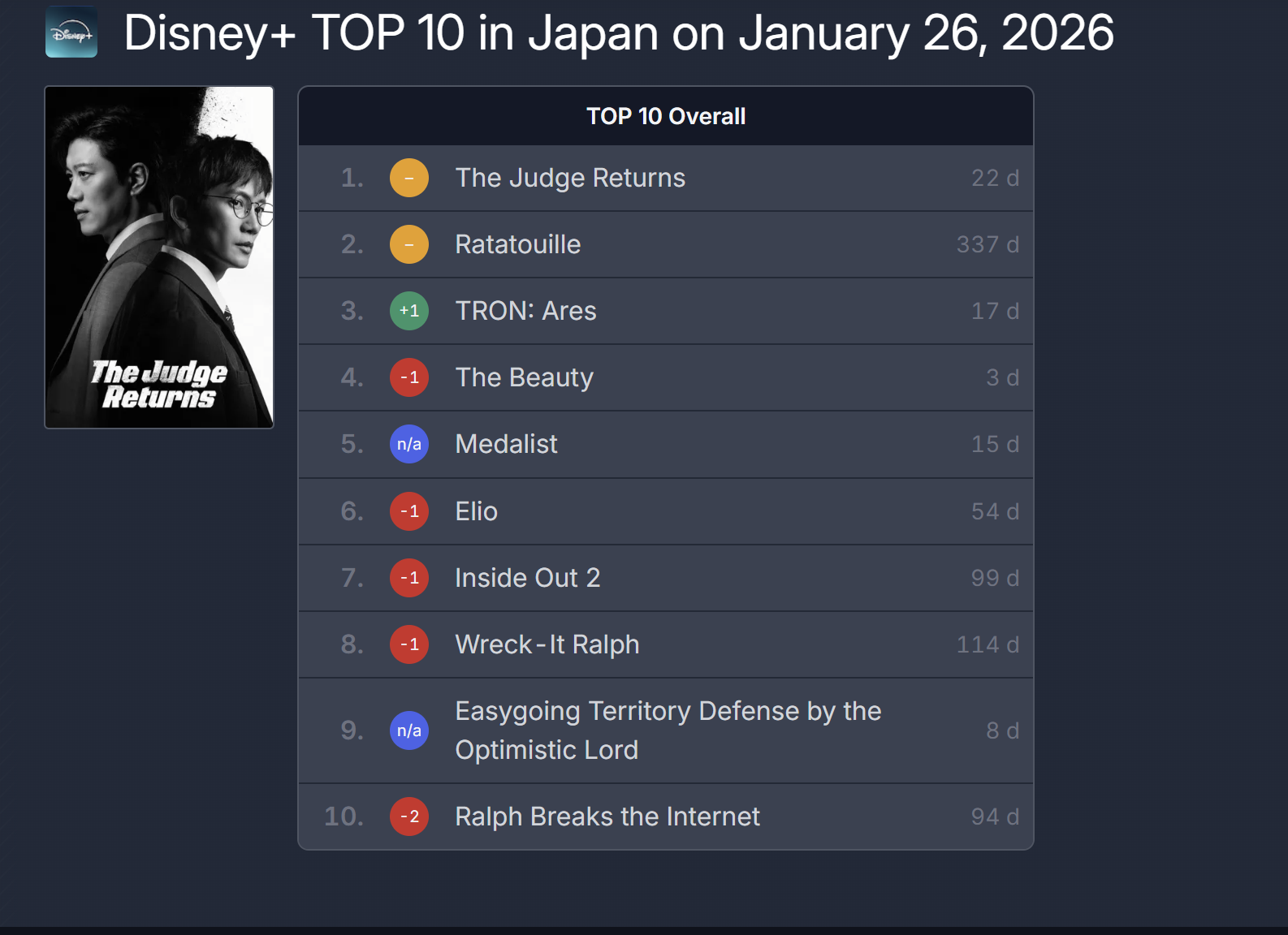 According to FlixPatrol, a global ranking aggregation site, MBC's Judge Lee Han-young ranked the first in viewership on Disney+) Japan during its premiere week and continues to maintain strong rankings in the Japanese market.