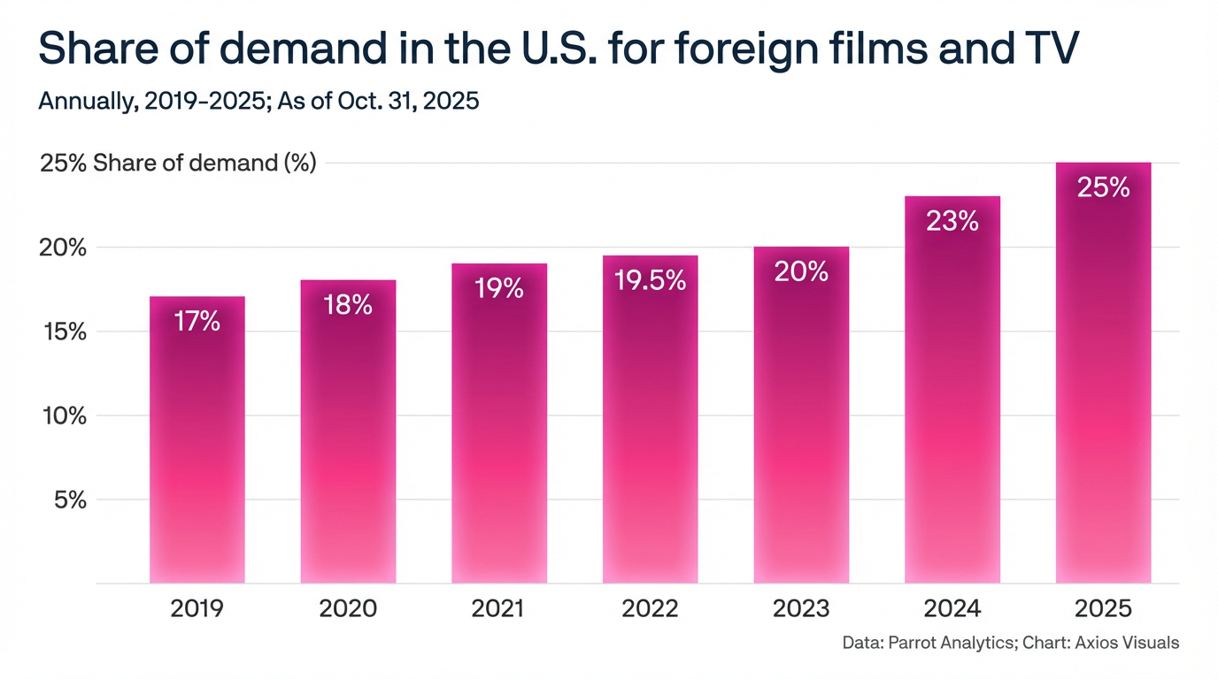 According to Parrot Analytics, the U.S. demand share for non-American content surged from 17.1% in 2019 to 25.3% in October 2025—an 8 percentage point jump in just six years. Streaming has torn down the barriers of language and borders.