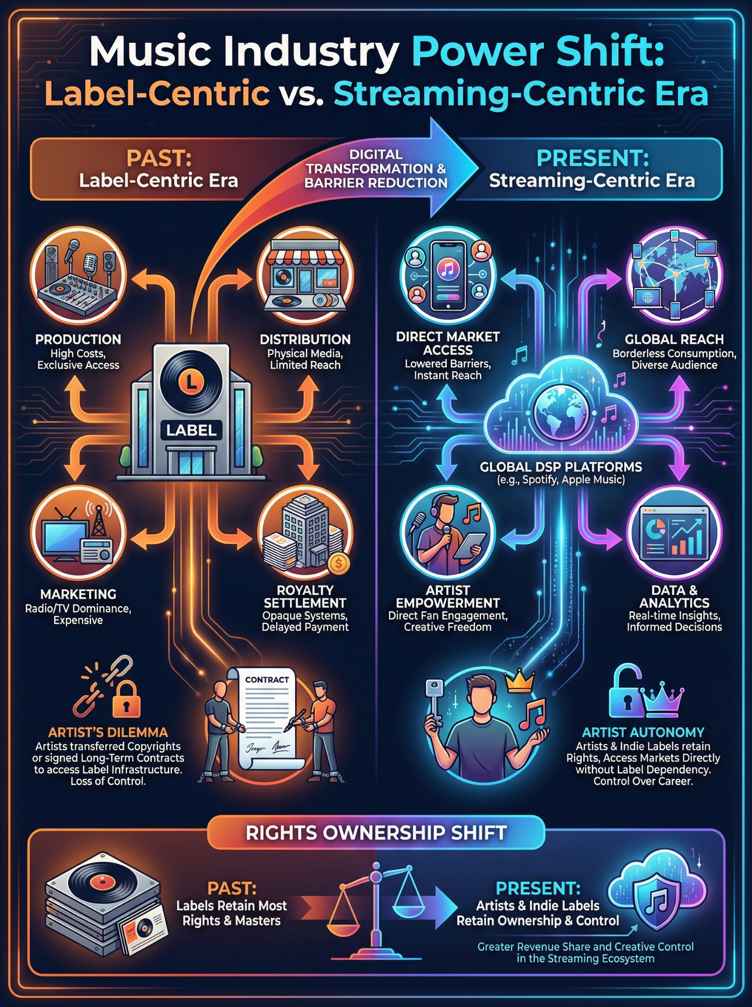 아티스트는 이러한 인프라에 접근하기 위해 저작권을 양도하거나 장기 계약을 체결하는 것이 일반적이었다. 그러나 디지털 전환(digital transformation)이 가속화되면서 이러한 구조는 빠르게 해체되고 있다. 콘텐츠 제작과 유통의 진입 장벽이 낮아지고, 글로벌 DSP 플랫폼이 표준화되면서 아티스트가 직접 시장에 접근할 수 있는 환경이 마련된 것이다.