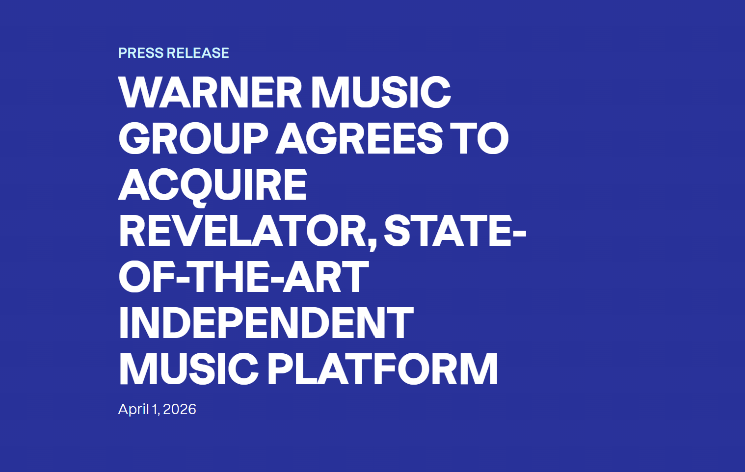 워너뮤직그룹(Warner Music Group, 이하 WMG)이 독립 음악 B2B 플랫폼 레벌레이터(Revelator)를 인수한다고 현지시간 2026년 4월 1일 수요일 오전 공식 발표했다. 이번 레벌레이터 인수 금액은 공개되지 않았으며, 통상적인 종결 조건(customary closing conditions)을 충족하는 절차를 거쳐 2026년 2분기(Q2 2026) 내 거래가 완료될 예정이다.